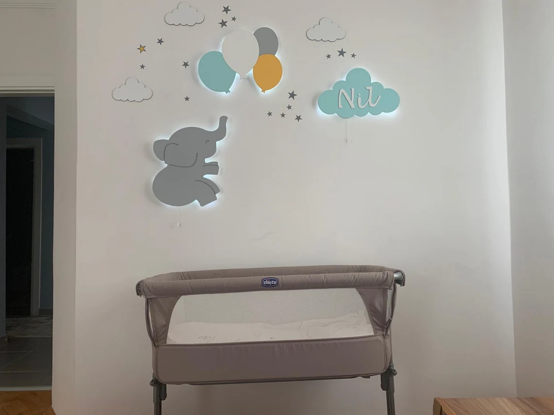 Tämä hurmaava seinävalaisin on suunniteltu erityisesti pienten unelmoijien huoneisiin. Sen yksityiskohtainen ja eloisa design, jossa harmaa norsu roikkuu ilmapalloista – yksi aurinkoinen keltainen, toinen taivaansininen, kolmas leikkisä vaaleanpunainen ja neljäs maanläheinen harmaa – vangitsee katseen ja herättää hymyn. Valmistettu laadukkaasta puusta, se on kestävä ja turvallinen valinta, joka kestää vuodesta toiseen. Taustavalaistuksen ansiosta valaisin luo ympärilleen pehmeän, epäsuoran valon, joka on miellyttävä silmille ja luo kutsuvan tunnelman. Se ei ainoastaan valaise huonetta, vaan toimii myös viehättävänä sisustuselementtinä, joka tuo persoonallisuutta ja lämpöä jokaiseen lastenhuoneeseen tai leikkipaikkaan.